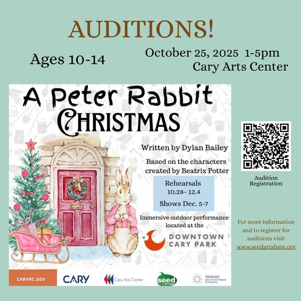 Join Mrs. Tiggy-Winkle and all of the animals in Mr. McGregor’s garden patch as they search for Peter Rabbit in this light-hearted Christmas mystery. A co-production with Seed Art Share, this show is a perfect way for the whole family to experience the magic of the holiday season as we step out of the theatre and into the Downtown Cary Park for this site-specific production.