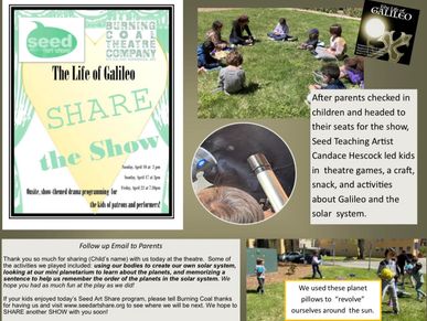 Since 2010, Seed Art Share has produced on-site, show-themed, “Share the Show” drama workshops for elementary-aged students at Triangle theatres such as The Justice Theatre Project, Bare Theatre, Playmakers Repertory Theatre Company, Burning Coal Theatre, and The National Women’s Theatre Festival. Programs may be customized for 2-3 hour matinees or as “camps” to coincide with adult theatre conferences. They may be funded by patrons as a youth “ticket” or offered as a free program with adult admission at the discretion of the host company. Children may participate in drama activities that reinforce the themes, styles, music, characters, (fictional or historical), and setting of the show. When parents check their children out of the program, they receive information explaining what their children have learned so they are able to discuss their shared art experiences on the ride home.